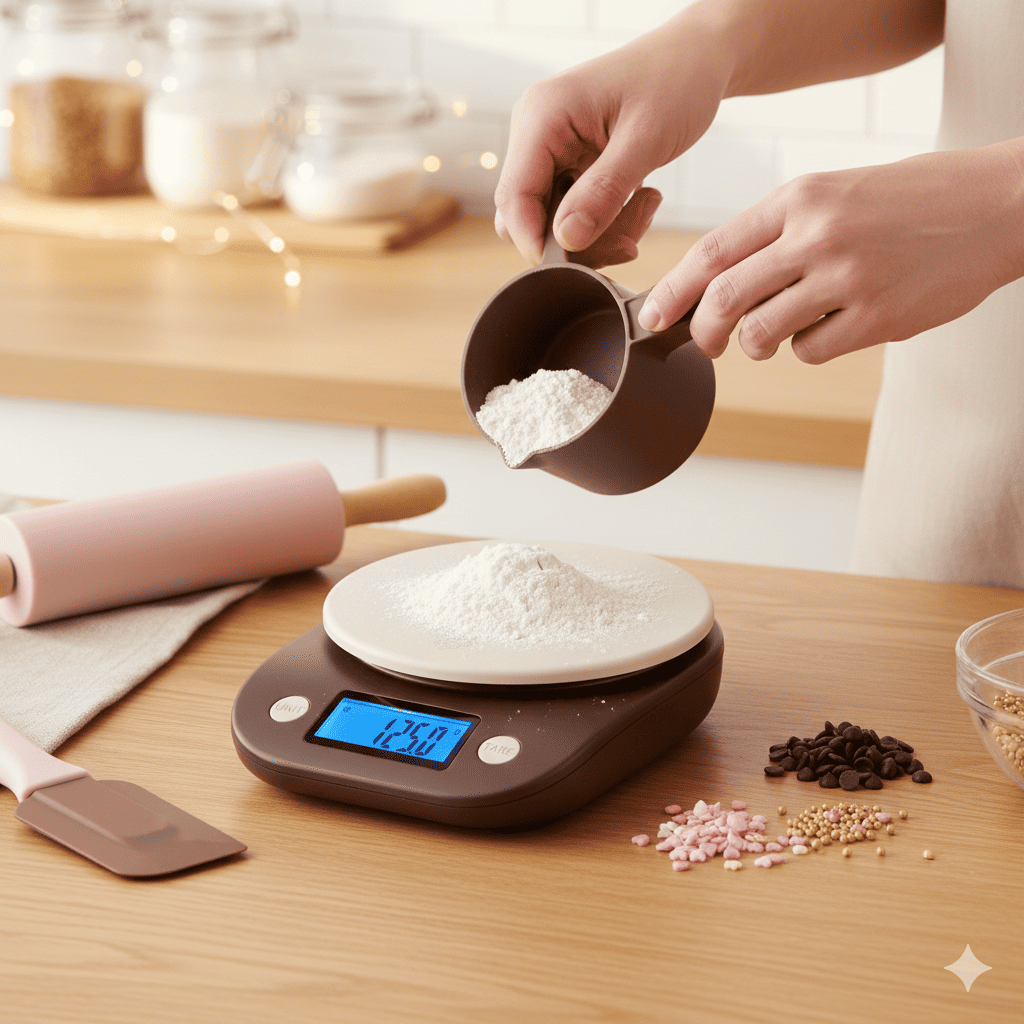 Báscula digital profesional con pantalla LCD, función tara, y botón de unidad (g / oz). Precisa y confiable para recetas que requieren medidas exactas — perfecta para repostería técnica y control de porciones. Pilas incluidas.