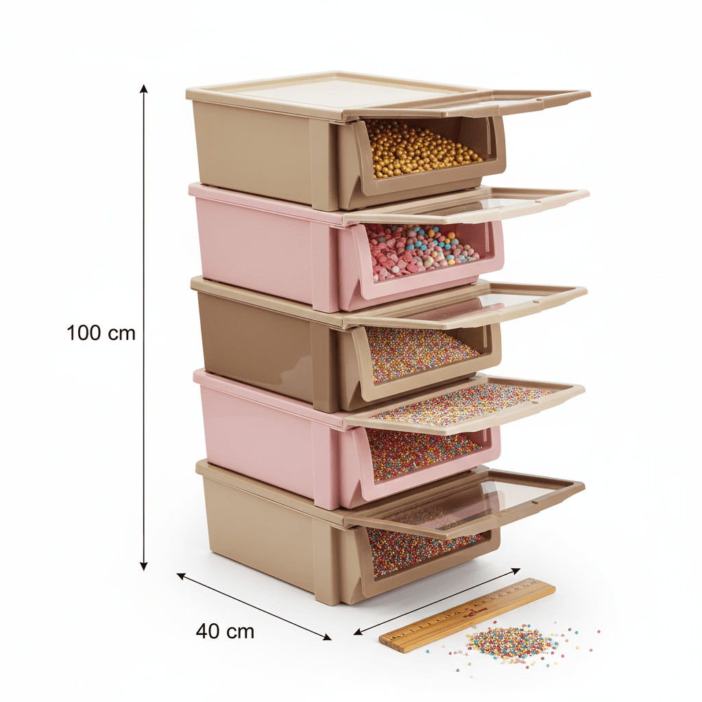 Sistema modular apilable pensado para optimizar el espacio vertical en despensas y armarios. Fabricado en plástico resistente, con posibilidad de combinar módulos para botellas, latas y paquetes. Facilita la rotación de productos y mejora la organización visual del espacio.