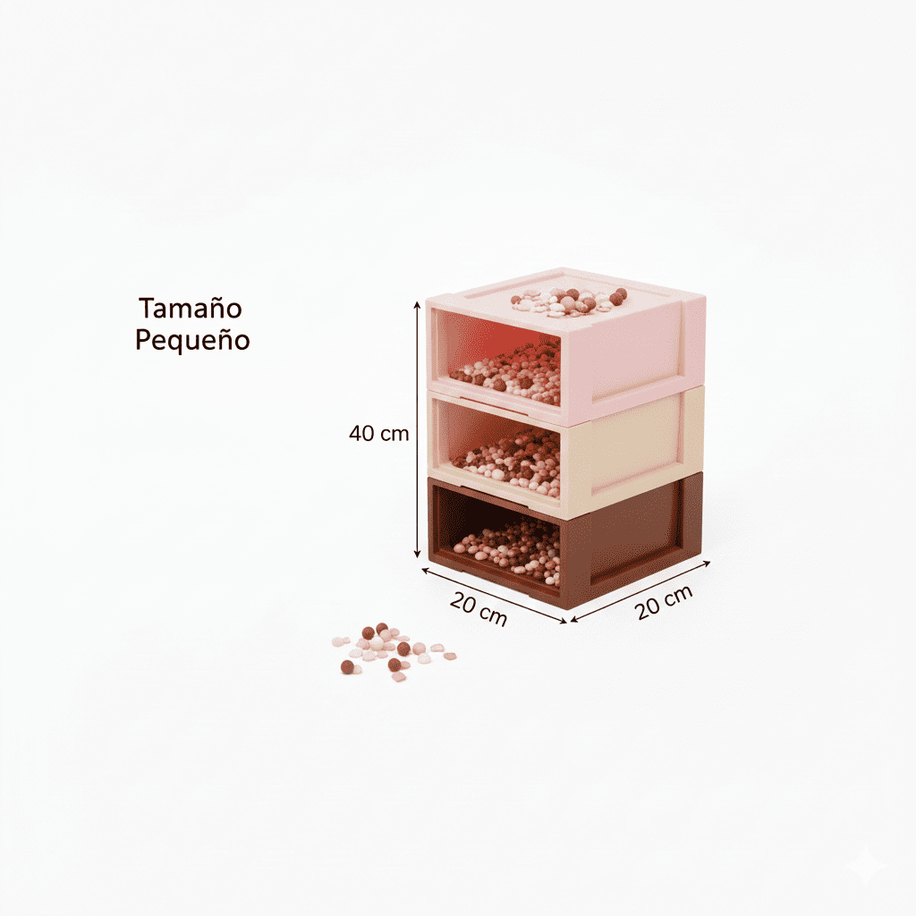 Organizador apilable disponible en tamaños pequeño, mediano o grande, ideal para optimizar espacio en la despensa.