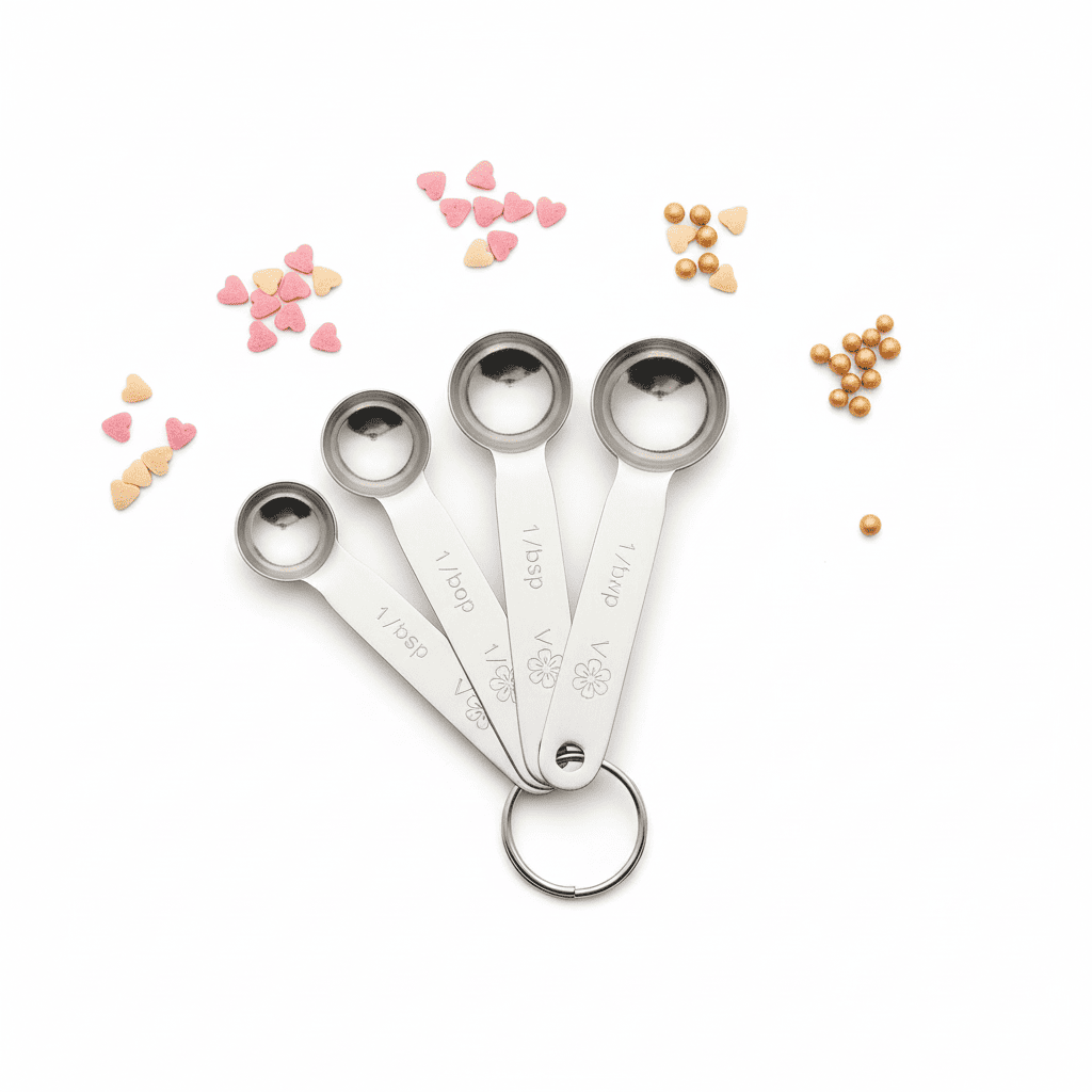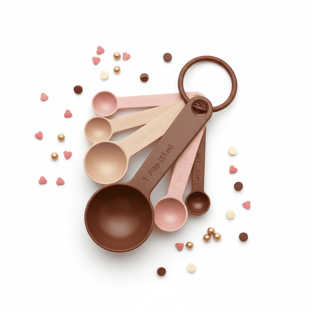Juego de cucharas medidoras (1/4 tsp a 1 tbsp) en acero inoxidable o plástico resistente. Prácticas, apilables y con marcajes claros para medidas precisas en repostería y cocina.