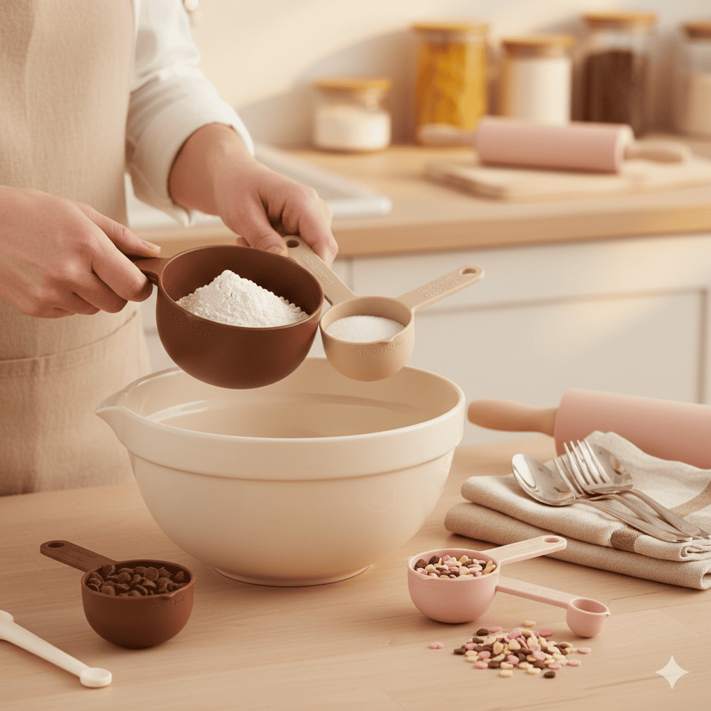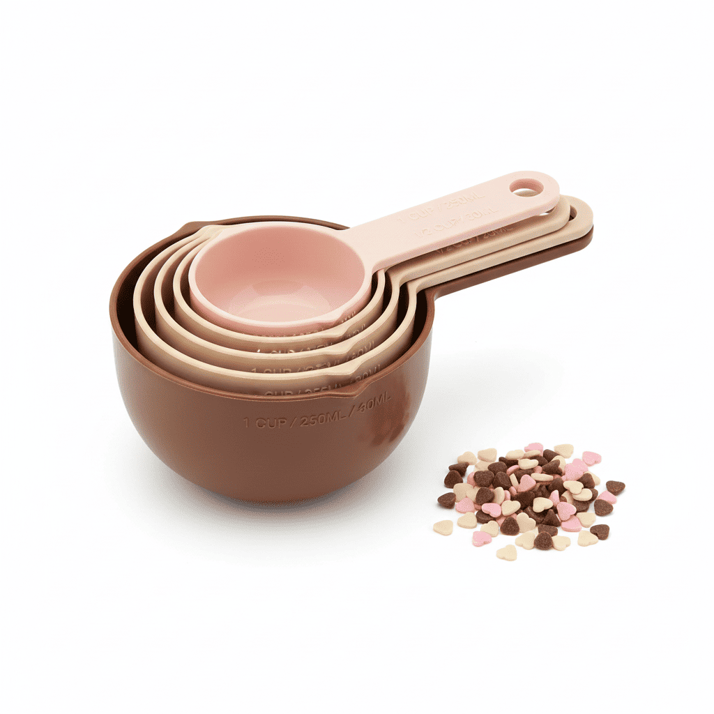 Conjunto de 5 tazas medidoras graduadas, resistentes y con marcajes claros. Ideales para medidas exactas en repostería. Aptas para lavavajillas y uso diario.